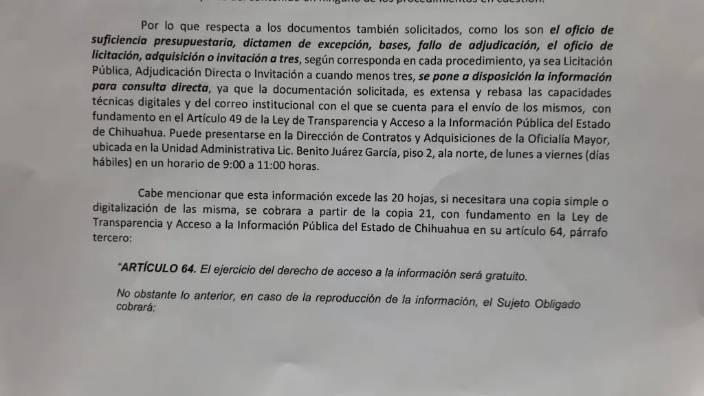 Como respuesta a las solicitudes de información vía Sistema Infomex con los folios 157112019, 157132019 y 157142019, en las cuales se solicitan documentos sobre adquisiciones hechas por el Gobierno Municipal, la unidad respondió que la información está disponible para consulta directa en las oficinas de Oficialía Mayor ubicadas en la Presidencia Municipal, y que en caso de necesitar copia simple o digitalización, se cobrará a partir de la copia 21, con base en la Ley de Transparencia y Acceso a la Información Pública del Estado de Chihuahua y la Ley de Ingresos del Municipio de Juárez para 2019. Sin embargo, Abril Amaya, analista de Contraloría Social de Plan Estratégico de Juárez aseguró que en esta última se establece que se cobrará por la copia fotostática simple y no por la digitalización, es decir, si pidieran una copia física del documento el cobro sería válido.