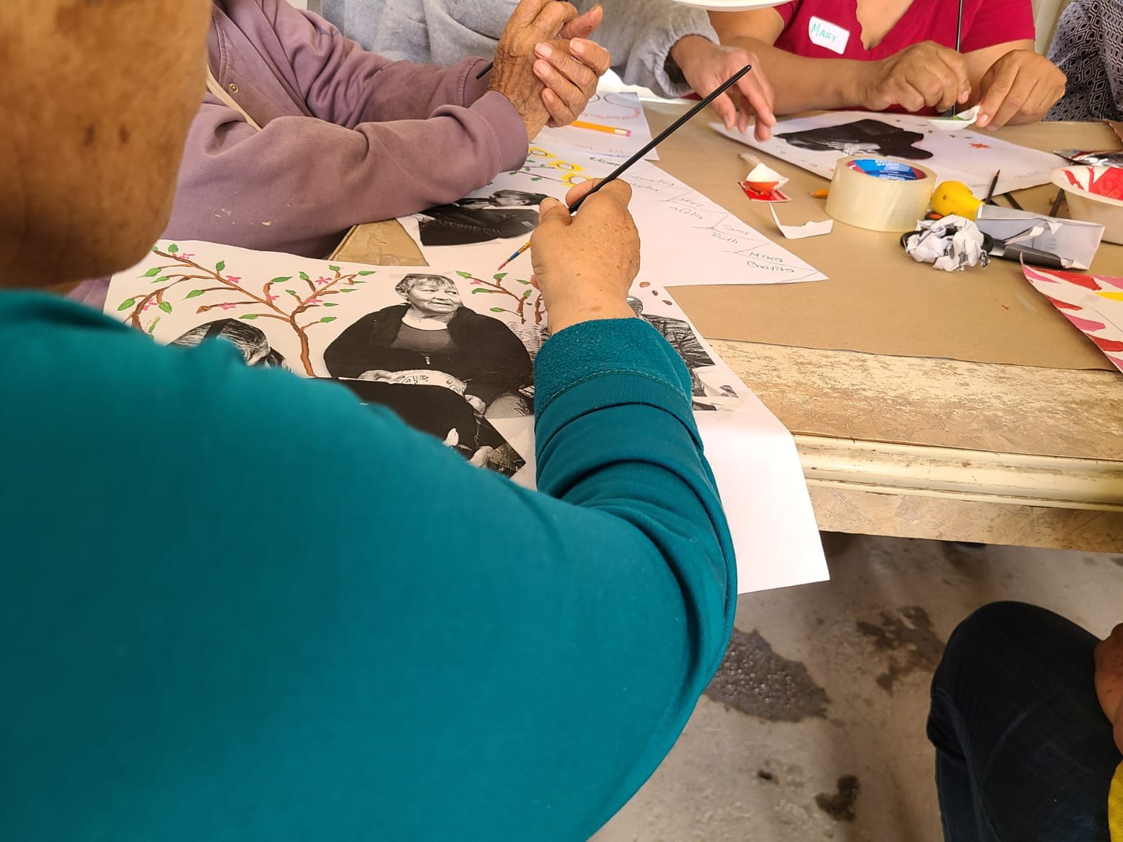 Durante la segunda sesión del taller, Las Comadres crearon collages con algunas fotos de sus momentos más significativos, plasmaron sus deseos para su colonia y pintaron con marcadores y pintura, usando como base una serie de expresiones que plasmaron en la sesión anterior: Entre las expresiones más repetidas estuvieron: “resistencia”, “comunidad”, “memoria” y “esperanza”.